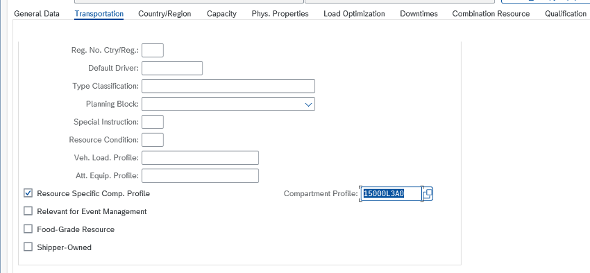 Still in /SCMTMS/RES01, under the Transportation tab, we selected a compartment profile. This profile is what effectively defines: